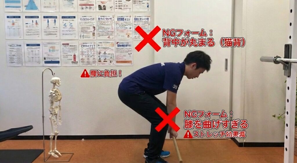 せっかくのストレッチも、フォームを間違えると逆効果になります。以下の2点に注意してください。