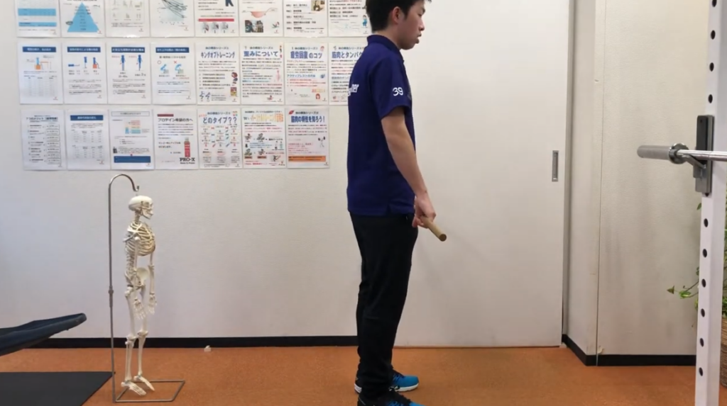 お尻を後ろの壁に向けてグーッと引いていくと、太ももの裏側(ハムストリングス)とお尻の筋肉が、ピーンと引き伸ばされる感覚がありませんか?それが正解です!