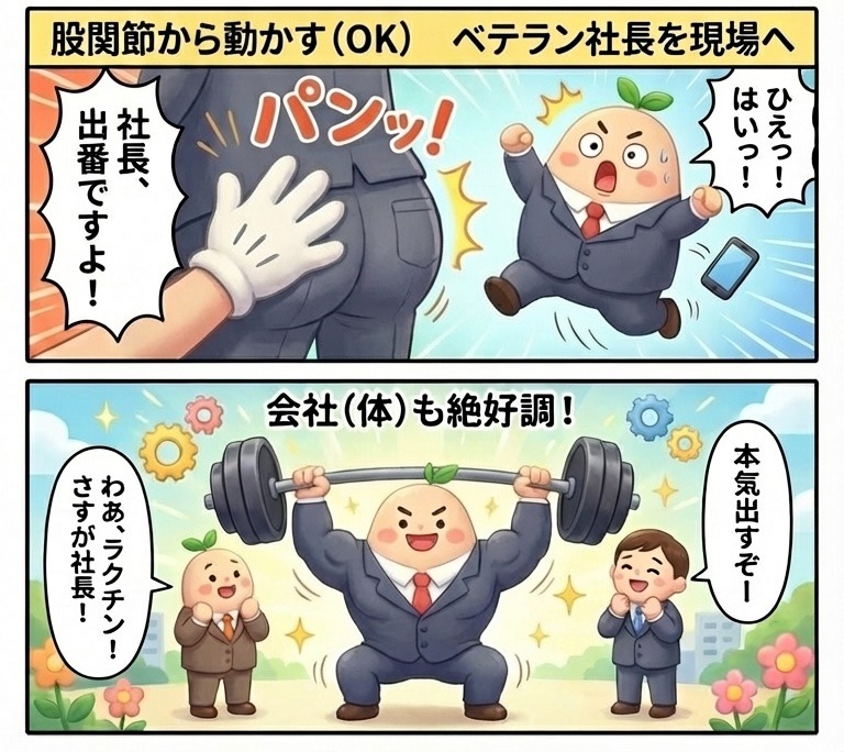 股関節から動き出すのは、サボっていた社長を現場に呼び出す「出動の合図」です。