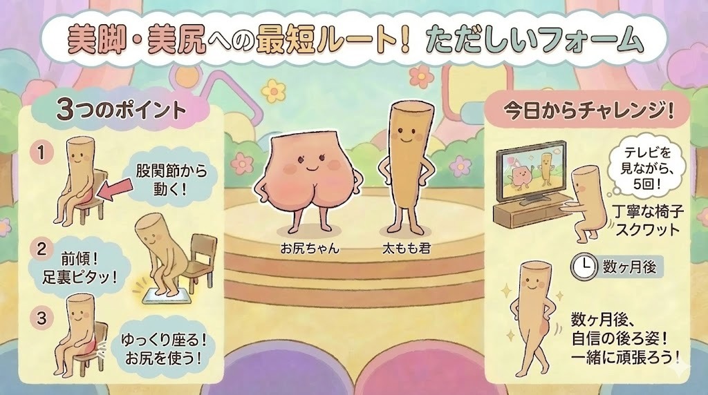 まずは今日から、テレビを見ている間や仕事の合間に、5回だけ「丁寧な椅子スクワット」を試してみてください。正しいフォームで行えば、たった5回でもお尻が熱くなるのを感じるはずです。