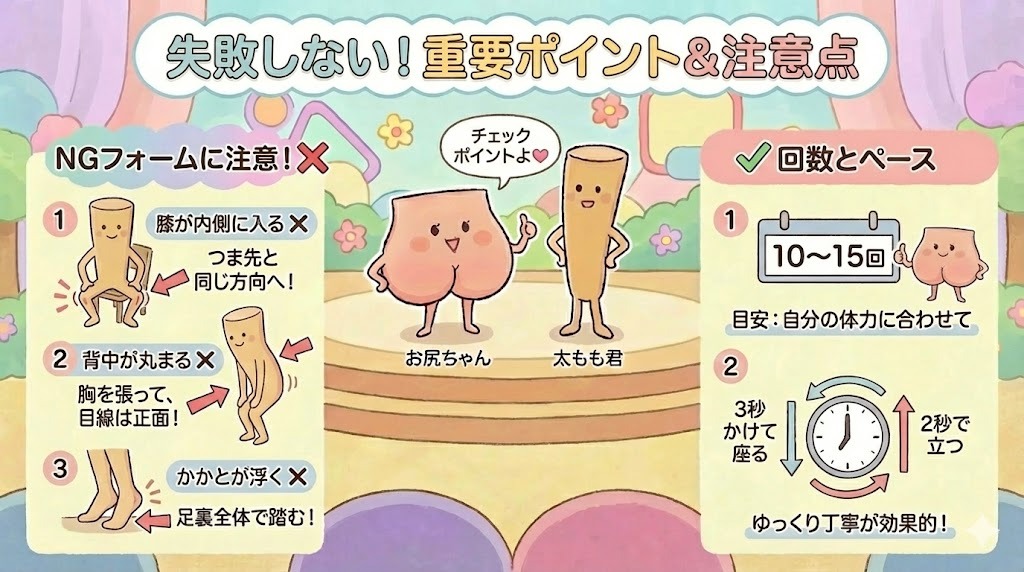 - ペース: 3秒かけて座り、2秒で立ち上がるような「ゆっくりとした動き」を意識すると効果絶大です。