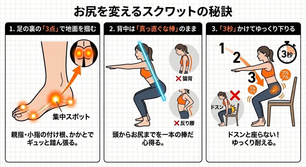 椅子を使ってスクワットをする際、以下の3つを意識するだけで、お尻への効果がさらに倍増します。