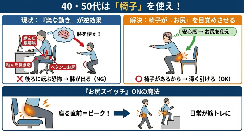40代・50代の多くは、長時間の座り仕事によって足の付け根(腸腰筋)が縮み、上半身の重みでお尻の筋肉がペタンコになり固まっています。すると脳は、使いにくくなった「お尻」を避けて、使いやすい「膝まわり」ばかりを使おうと命令を出します。そのため、日常生活の動作やスクワットをしようとしても、正しい動かし方ができなくなっているのです。