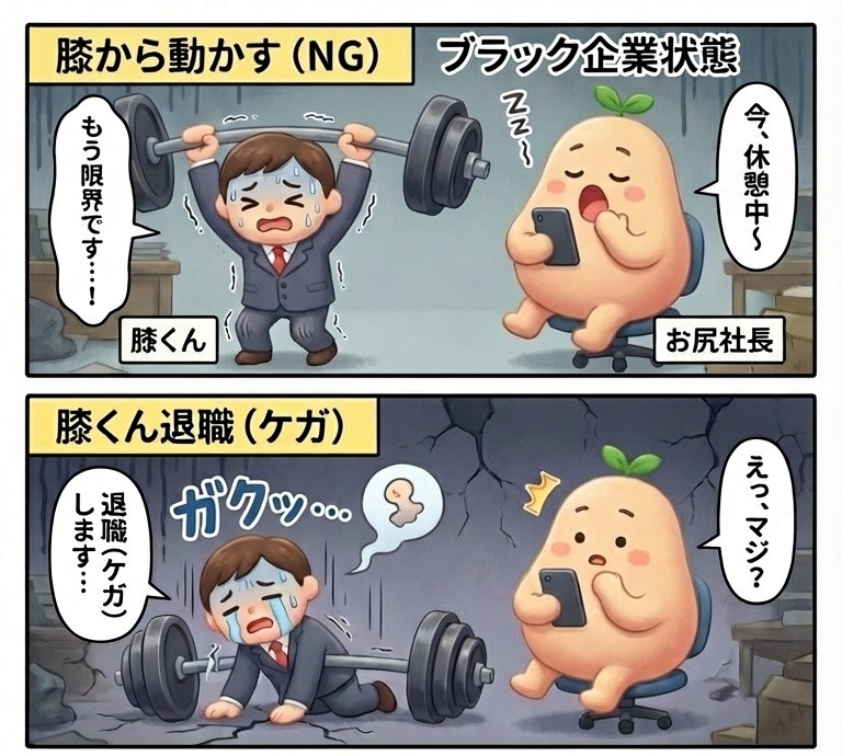 ・新人「膝くん」は限界!「体重」という重労働をすべて一人で抱え込み、キャパオーバー。放置すると「退職(ケガ)」してしまいます。