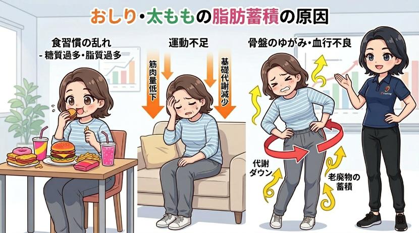 お尻の横に余分なお肉がつく理由としては、大きく二つ考えられます。それは脂肪の蓄積と筋肉太りです。この二つを開設していきます。