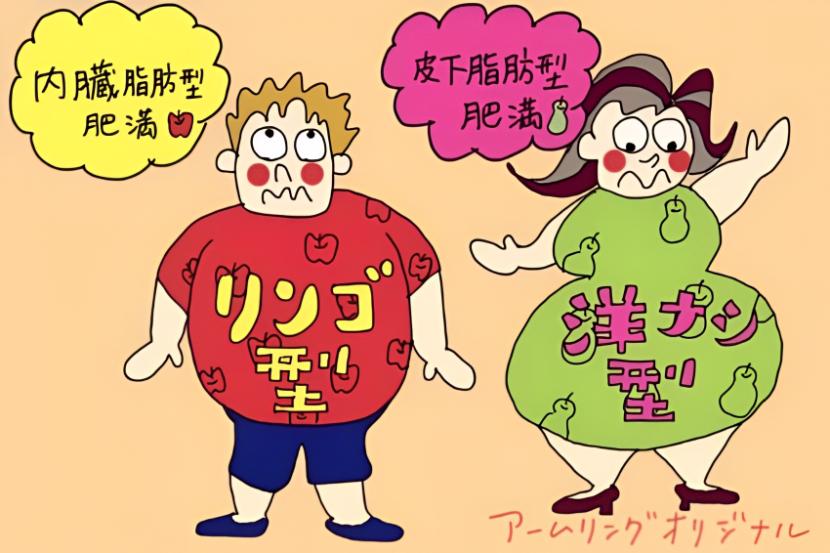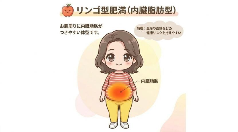 内臓脂肪が多い肥満体型を「リンゴ型肥満」とも言います。「お腹パンパンに膨れて見える」「付きやすく落ちやすい」「血圧や血糖などの健康リスクを抱えやすい」「男性に付きやすい」という特徴があります。