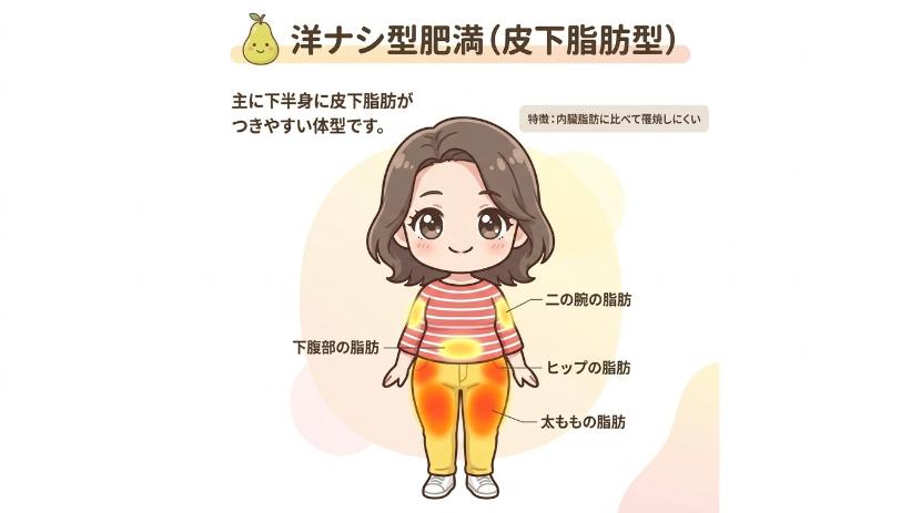 皮下脂肪は、皮膚と筋肉の間に蓄積し、指で摘むことができ、お尻やお腹、太もも、二の腕につきやすいのが特徴になります。 男性よりも女性につきやすく、皮下脂肪が多い肥満体型を「洋ナシ型肥満」とも言います。女性には「お腹の子どもを守る」という重要な役目があるため、つきやすいのではないかと言われています。