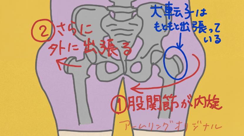 しかし股関節の使い方により大転子の引っ込み方が変わります。「股関節の内旋」が強いと大転子は外側に出っ張って見え、「股関節が外旋」していると自然と中に収まる形になります。簡単に言うと、姿勢が内股の方は、外側に出っ張って見えます。