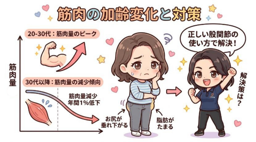 日常生活を送っているだけだと30歳以降、年間1%ずつ筋肉は低下します。そのため、お尻の筋肉は徐々に垂れ下がり、基礎代謝も低下するために脂肪も溜め込みやすくなります。ですから、お尻をしっかり鍛える必要があるのです。
